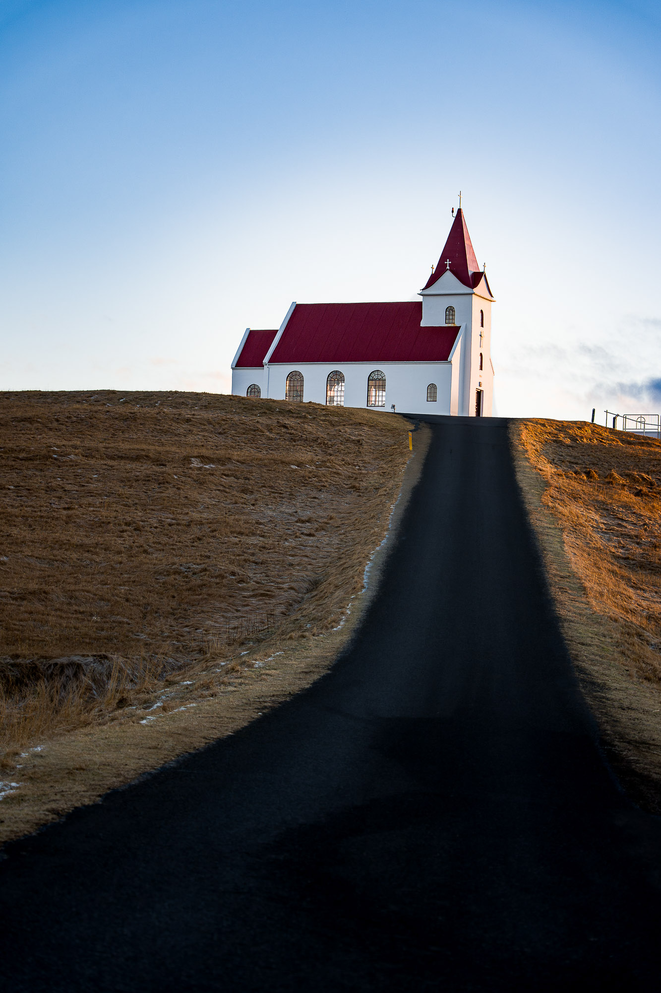 Sie sollte unsere dritte Kirche auf der Halbinsel sein. Die Ingjaldshólskirkja thront auf einem Hügel in Westisland. Eine dunkle Straße führt gerade aus auf den Hügel, links und rechts gesäumt von goldenem, welken Gras. Die kleine weiße Kirche mit ihrem schlichten roten Dach bildet einen harmonischen Kontrast zur weiten, offenen Landschaft, die sich rundherum erstreckt.